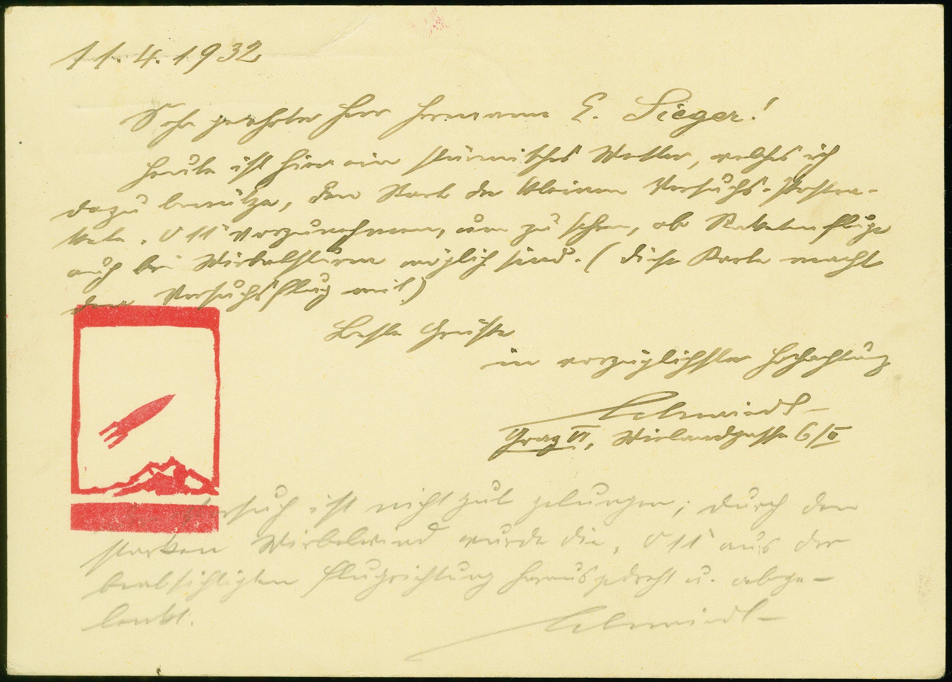 AUSTRIA, 1932, Schmiedl experimental rocket V11 from April 11th, postal stationery card Hopferwieser Fs -12b 10 Groschen with machine cancellation "GRAZ 1.V.32" and with red illustrated handstamp as well as handwritten note "flown with postal rocket V11". Schmiedl's signature addressed to Lorch, Germany to the famous Airmail and Zeppelin specialist Herman Sieger with extensive text on the reverse and additional red handstamp, in perfect condition, very rare, only 14 cards were carried. Extremely rare especially in this condition! , Hopferwieser €3500