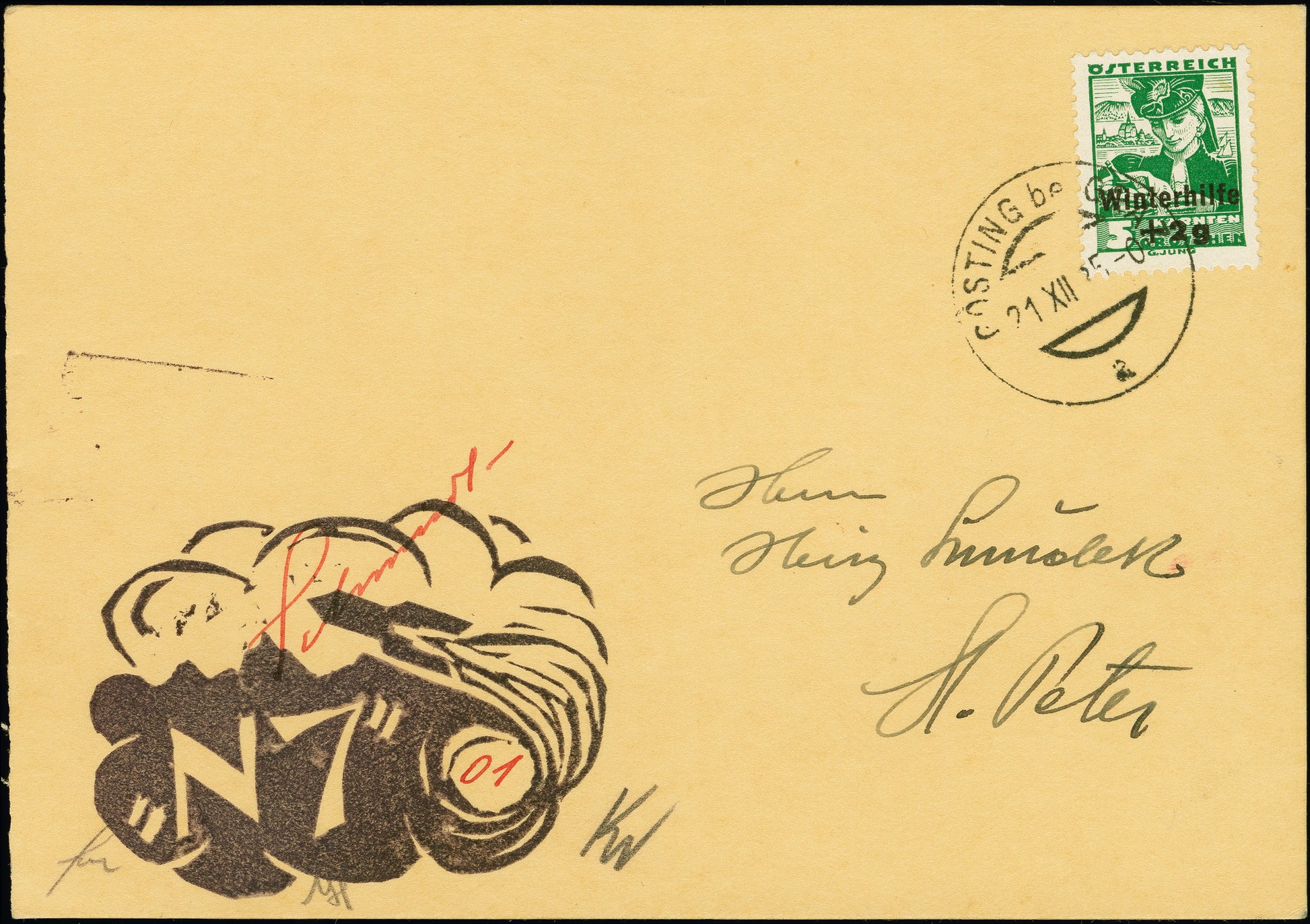 AUSTRIA, 1935, December 21, Rocket Flight N7 (Hopferwieser FS-44b). Card with Scott B128 Semi-Postals 5 g + 2g, tied by circular date cancel GÖSTING-GRAZ dated December 21st with violet rocket N6/27 cachet, signed Schmiedl, Very Fresh, Very Fine, Back indicates "28 flown." Very rare! Hopferwieser €3,500