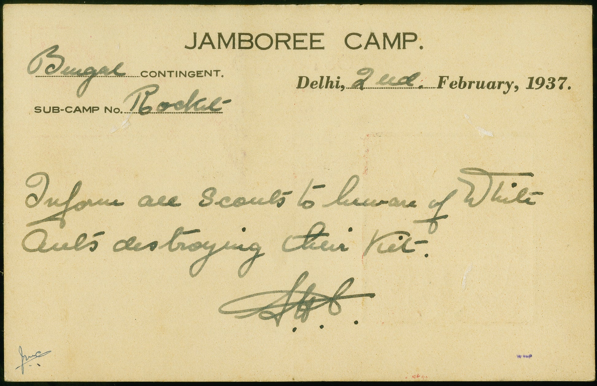 INDIA 1937 Smith Rocket No 137 (Hopferwieser SS38)- Dr. M. Kronstein. Preprinted multicolor card featuring an elephant. Red rocket vignette "ALL INDIA BOY SCOUTS JAMBOREE DESPATCH DELHI 2.FEB.1937" tied by very well-marked Delhi cancellation, addressed to Delhi with Stephen H. Smith's signature on elaborate printed reserve featuring the camp information. Outstanding condition. Rare! Great exhibit item for Rocket, Elephant and Scouts collectors!